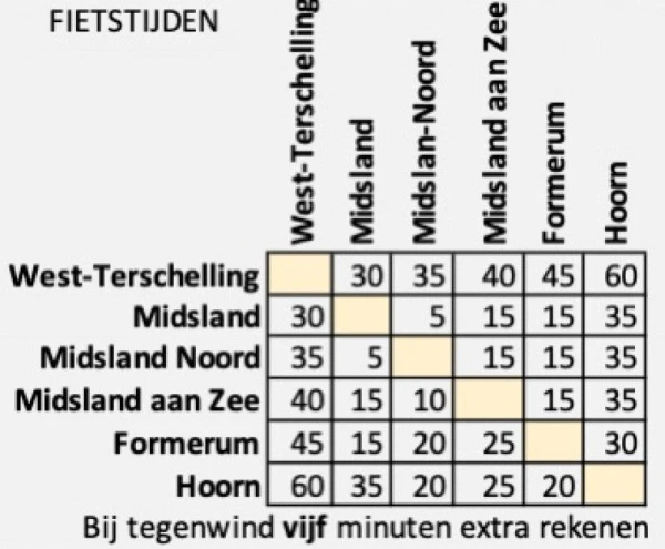 De afstanden op het eiland zijn goed te doen op de fiets, zeker met een electrische fiets. Aan de hand van deze fietstijden hierboven kun je goed bepalen hoeveel tijd je nodig hebt om van de ene naar de andere voorstelling te komen.