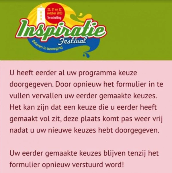 Dan heeft u te lang over de keuze nagedacht. Dit is ingebouwde veiligheid in het systeem. Als u bijvoorbeeld ‘s avonds het formulier heeft geopend en deze de volgende ochtend instuurt zal deze melding verschijnen. In dat geval is uw keuze niet opgeslagen. U kan uiteraard wel weer opnieuw gebruik maken van de toegestuurde link voor het samenstellen van uw programma. Als alles goed is afgerond ontvangt u een bevestiging met daar een overzicht van uw keuze.